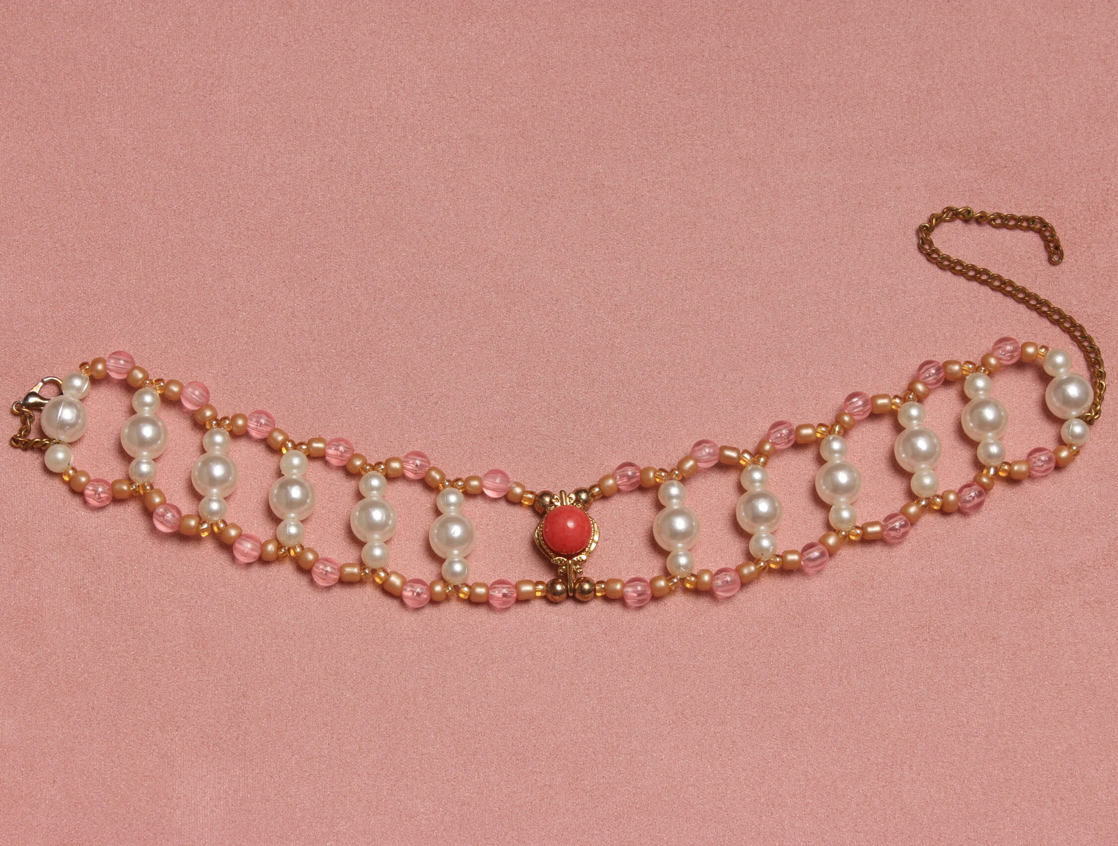 Ce collier vintage se porte en ras de cou. Le mariage des couleurs roses, blanches et dorées apporte beaucoup de douceur. Il est délicatement rehaussé d’un pendentif upcyclé doré orné d’une magnifique perle rose.
