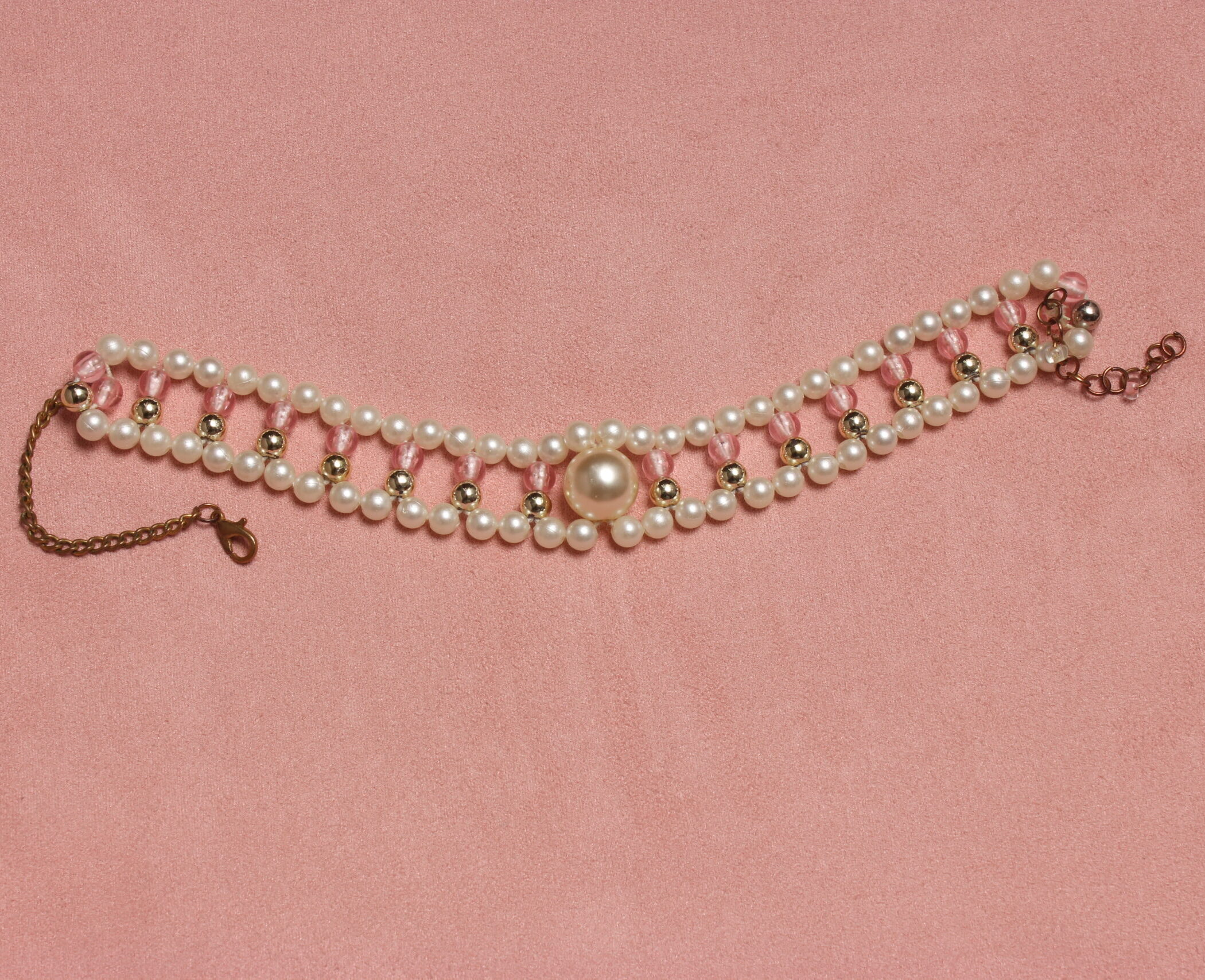 Ce collier vintage se porte en ras de cou. Le mariage des couleurs rose pâle, blanche et dorée apporte beaucoup de douceur. Il est élégamment rehaussé d’une perle blanche nacrée en son centre.