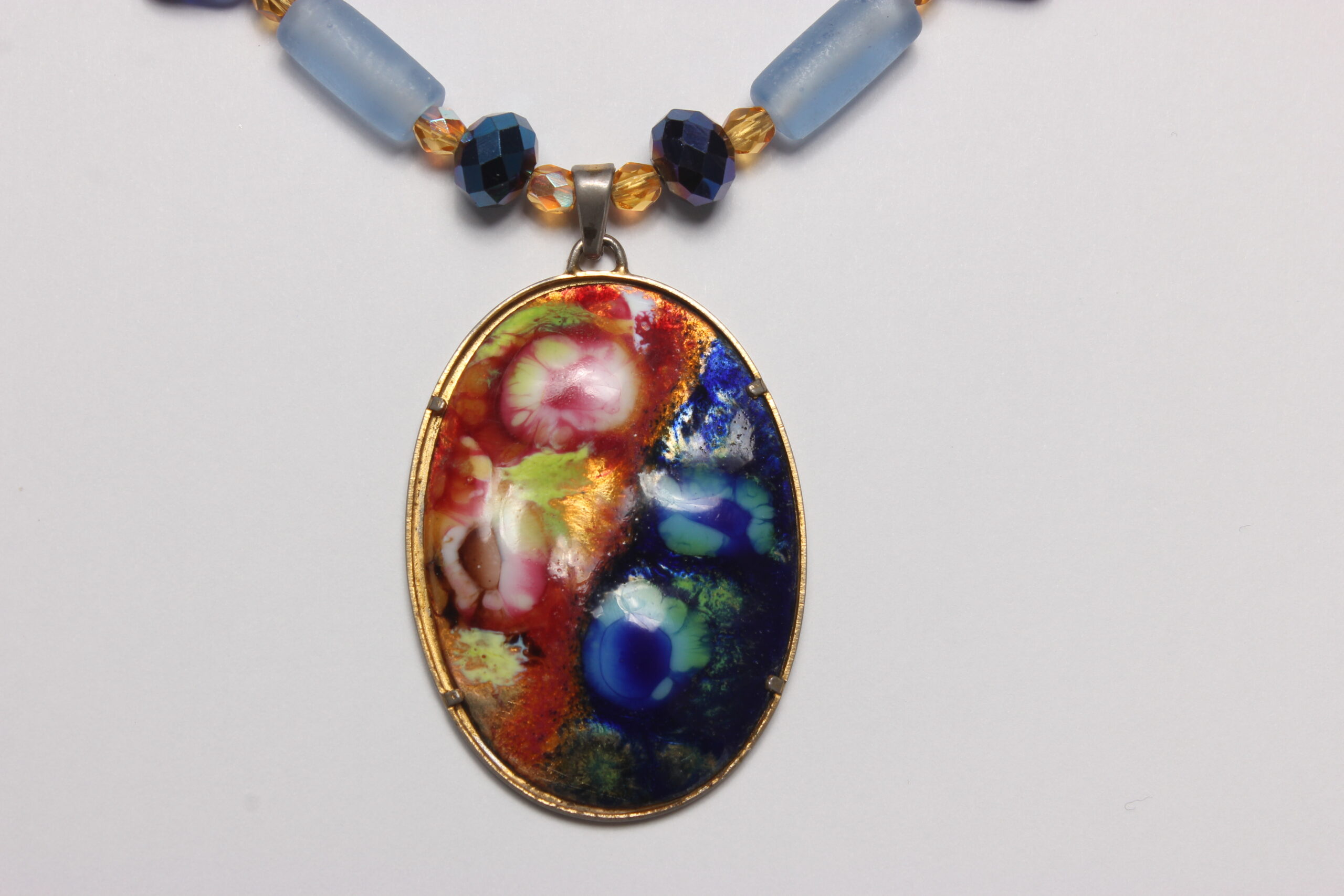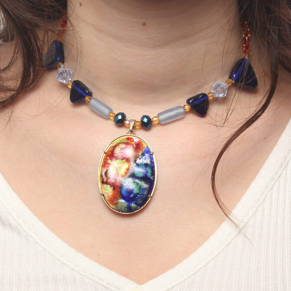 Le vintage est au rendez-vous avec ce magnifique collier. L’alternance des couleurs complémentaires bleues et orange rappelle le jour et la nuit, la nature est à l’honneur. Les perles bleues marines en forme de triangle ainsi que les bleues claires en forme de tube sont en verre. Il est délicatement rehaussé d’un pendentif ovale upcyclé en émail peint aux motifs fleurs multicolores. Ce pendentif est une pièce des années 70 qui appartenait à mon arrière-grand-mère, il possède quelques marques d’usure à l’arrière mais il mérite une seconde vie. Les émaux de collection ne sont pas faits pour être délaissés et c’est là que l’upcycling prend tout son sens.