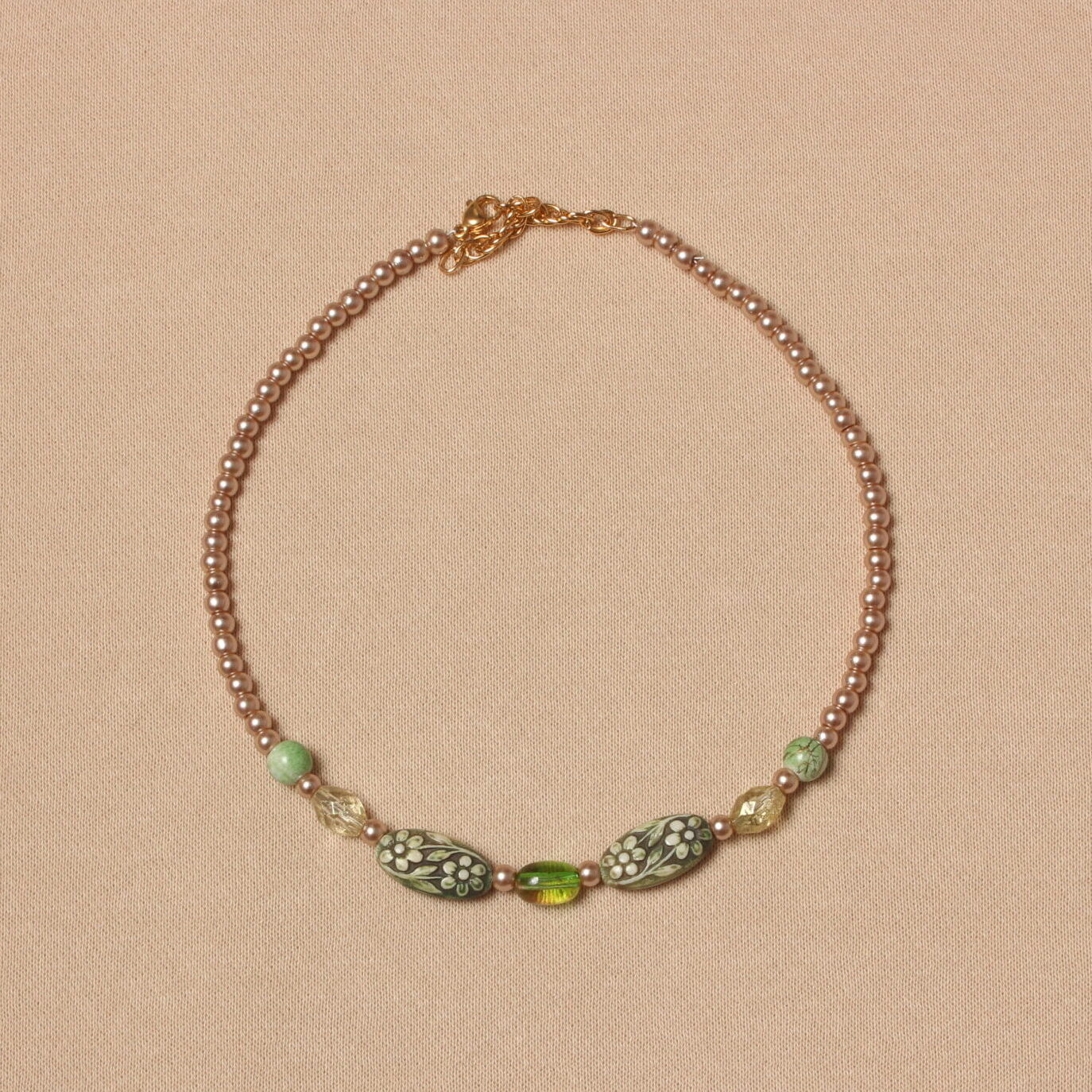 Élégance et romantisme avec ce collier vintage vert et beige. Les petites perles beiges sont en verre. Il est délicatement rehaussé de 2 magnifiques perles upcyclées vertes avec des fleurs. Son nom « Nostalgie » vient notamment de ces 2 perles car elles appartenaient à un collier de mon arrière-mamie.
