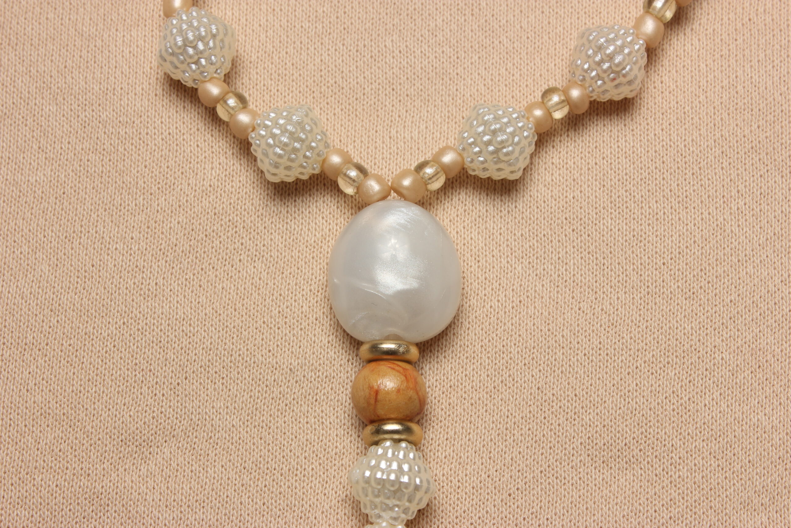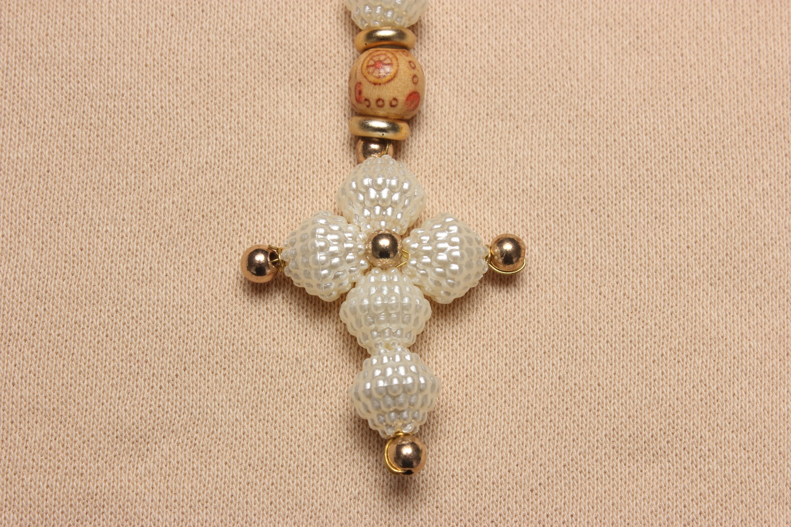 Ce dizainier, à la fois sobre et raffiné, est composé de perles beiges fantaisies et dorées et rehaussé de 2 perles en bois et une jolie perle beige irisée upcyclée. La croix est également créée à la main.